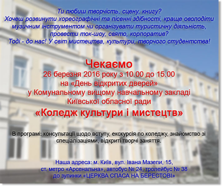 У коледжі культури і мистецтв проходив День відкритих дверей – профорієнтаційний захід, в ході якого гості мали змогу ознайомитися з навчальною, виховною, мистецькою діяльністю коледжу, відвідати відкриті уроки та майстер-класи наших провідних викладачів – народної артистки України А.Мамченко, заслужених артисток України Жанни Боднарук, Л.Придіус, І.Гончарової, Астраї, заслуженого діяча мистецтв України В.Л.Полянського, популярної артистки театру і кіно В.Біблів, виступи студентських творчих колективів.
