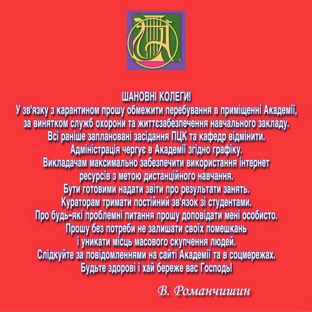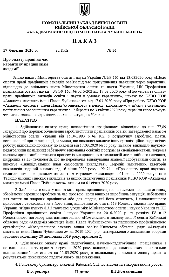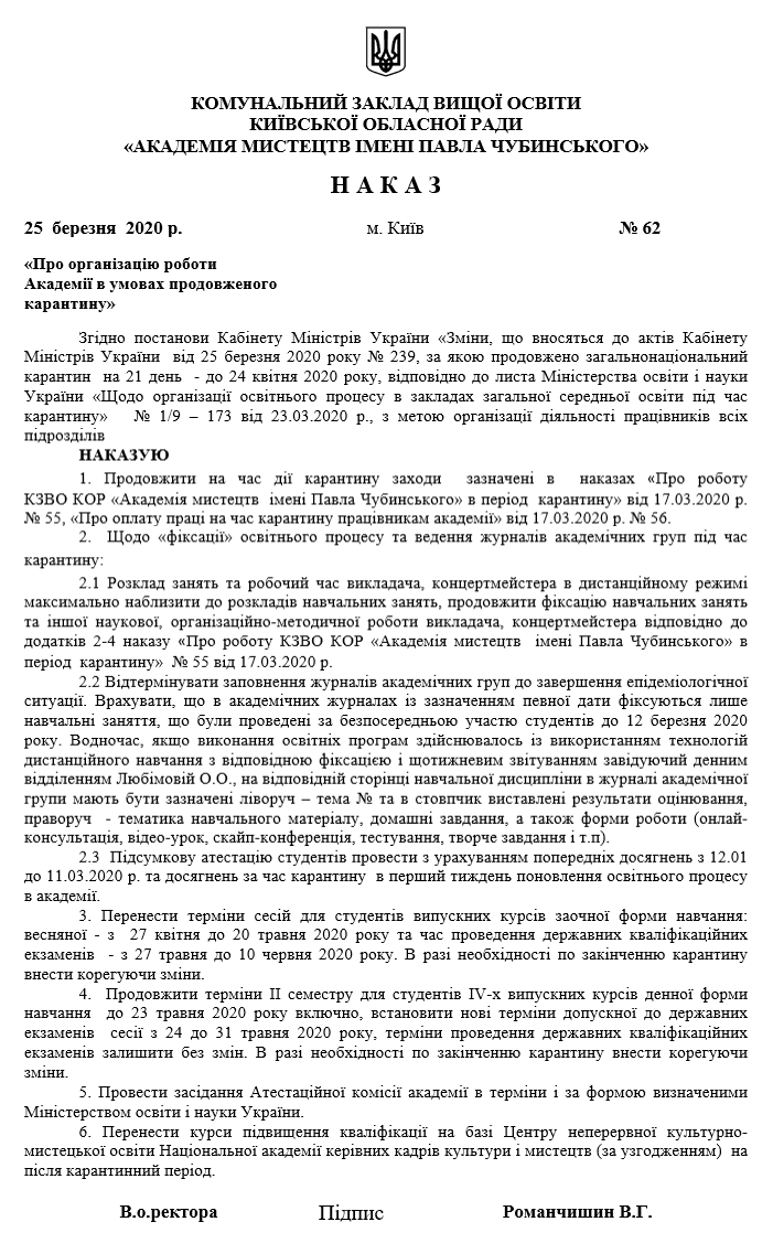 НАКАЗ №55 про роботу КЗВО КОР «Академія мистецтв імені Павла Чубинського» в період карантину