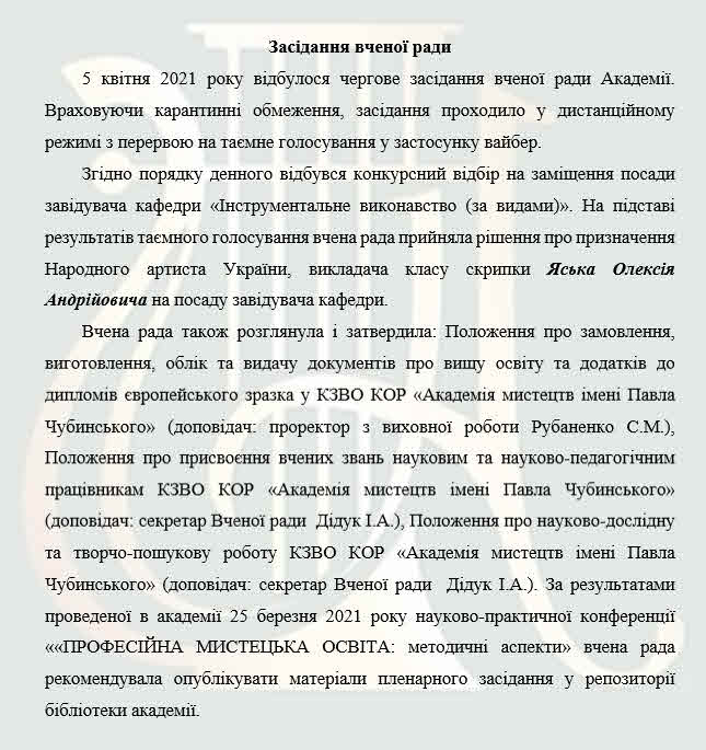 5 квітня 2021 року відбулося засідання вченої ради академії