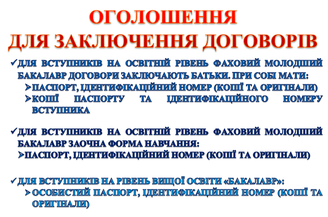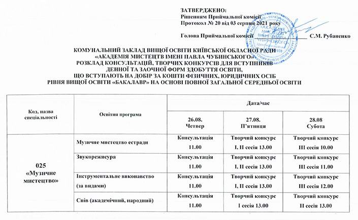 Розклад консультацій, творчих конкурсів для вступників денної та заочної форм здобуття освіти, що вступають на добір за кошти фізичних, юридичних осіб рівня вищої освіти "Бакалавр" на основі освітньо-кваліфікаційного рівня "Молодший спеціаліст"