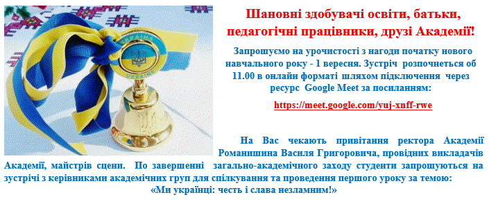 В актовій залі Академії відбулася творча зустріч і знайомство 1-х та 4-х курсів спеціалізації «Видовищно-театралізованих заходів». Під час зустрічі академічні групи обмінялися творчими показами. Так, студенти 1-их курсів представили себе через скоромовки, а 4-ий курс показав патріотичні композиції про Україну. Зустріч пройшла в теплій атмосфері. Створення на початку навчання атмосфери взаємоповаги, довіри та творчості - важливий корок до успіху.