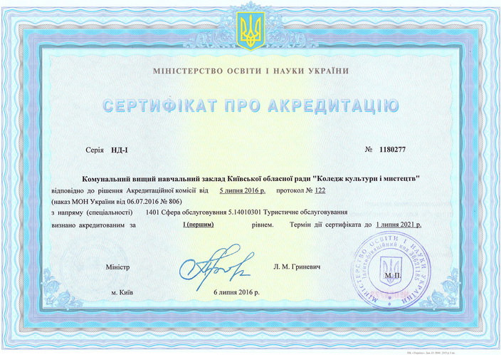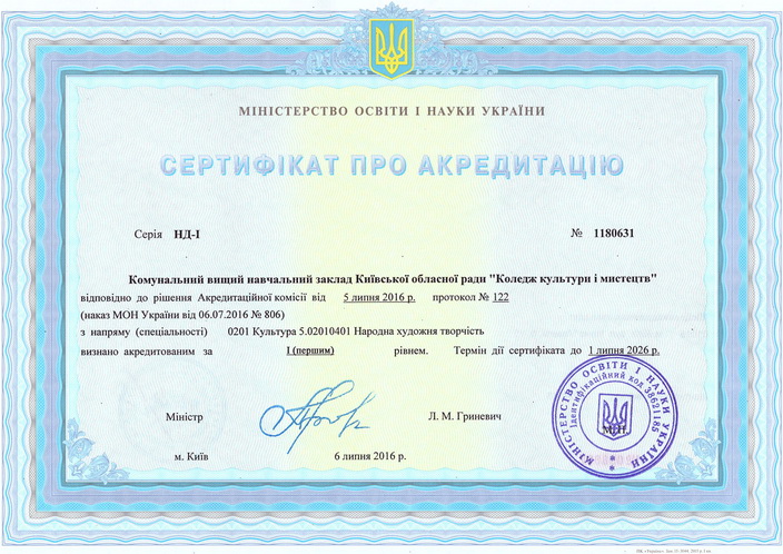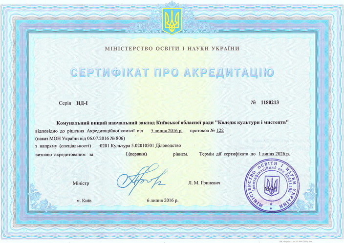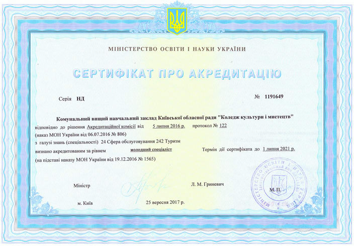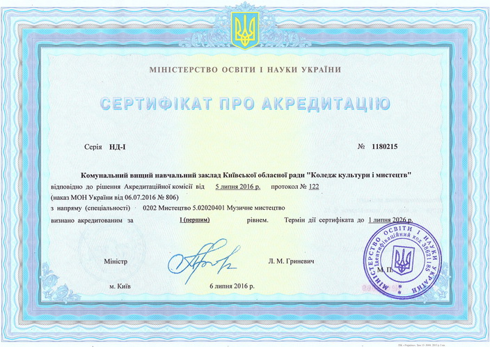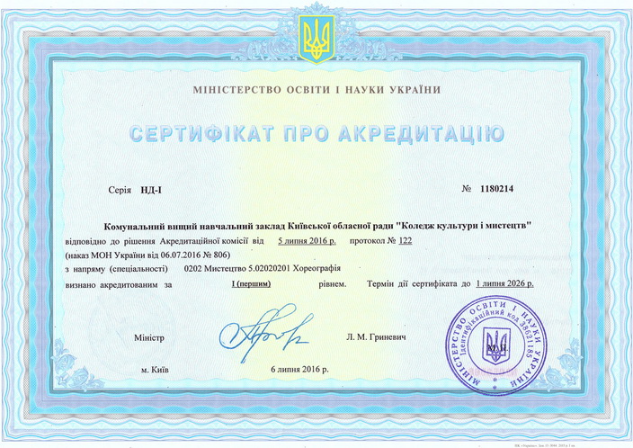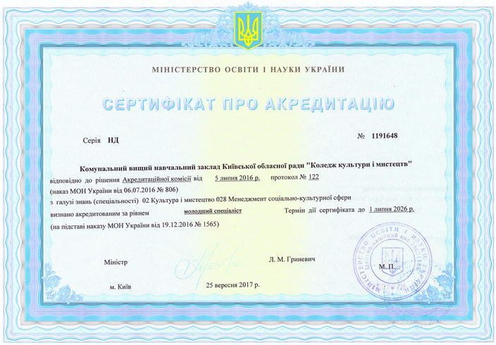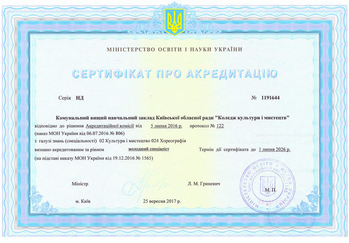 У 2016 році Міністерством освіти і науки України навчальний заклад було акредитовано за спеціальностями: «Хореографія», «Менеджмент соціокультурної діяльності», «Музичне мистецтво», «Сценічне мистецтво» – на 10 років.
