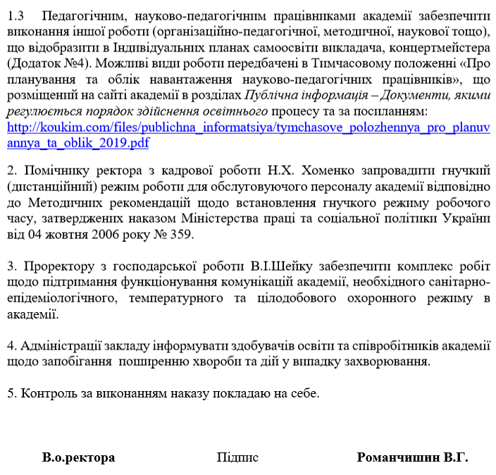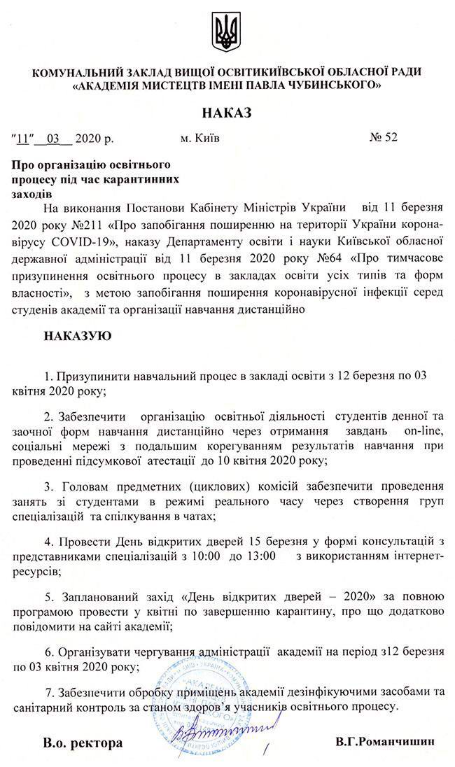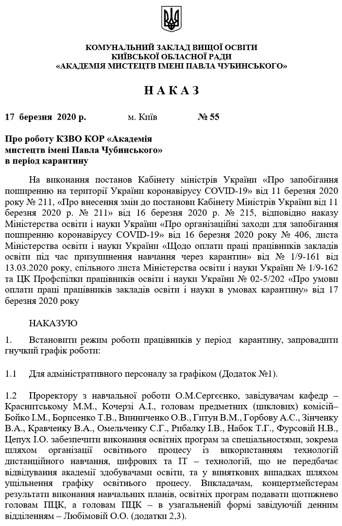 НАКАЗ №55 про роботу КЗВО КОР «Академія мистецтв імені Павла Чубинського» в період карантину