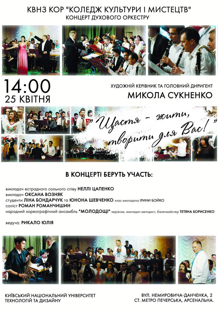 В Київському національному університеті технологій та дизайну духовий оркестр коледжу (художній керівник та головний диригент М.А.Сукненко) шанувальникам духової музики представив нову концертну програму «Щастя – жити, творити для Вас».