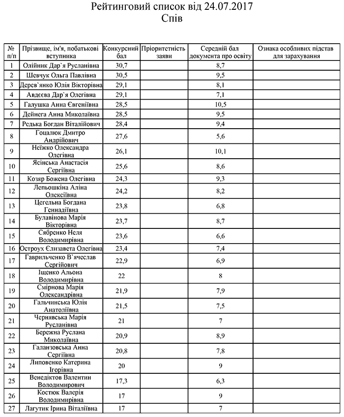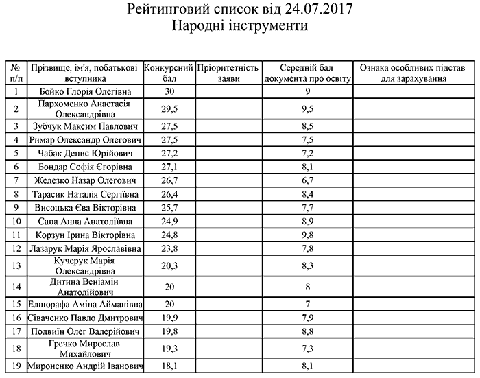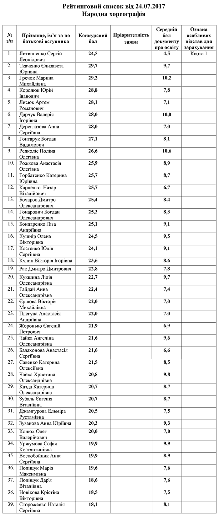 Спеціальність 024 «Хореографія» Спеціалізація «Народна хореографія» група 2 Дата проведення вступного випробування «21» липня 2017 року.