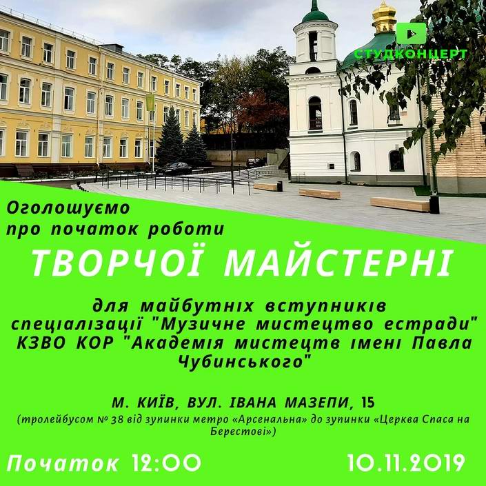 Молодіжна громадська організація "Студконцерт" розпочинає роботу творчої майстерні для майбутніх вступників Комунального закладу вищої освіти Київсько обласної ради "Академія мистецтв імені Павла Чубинського" спеціалізації "Музичне мистетцво естради".