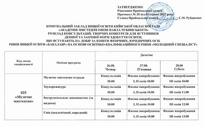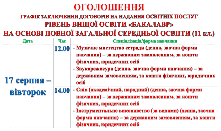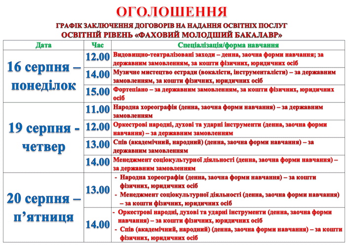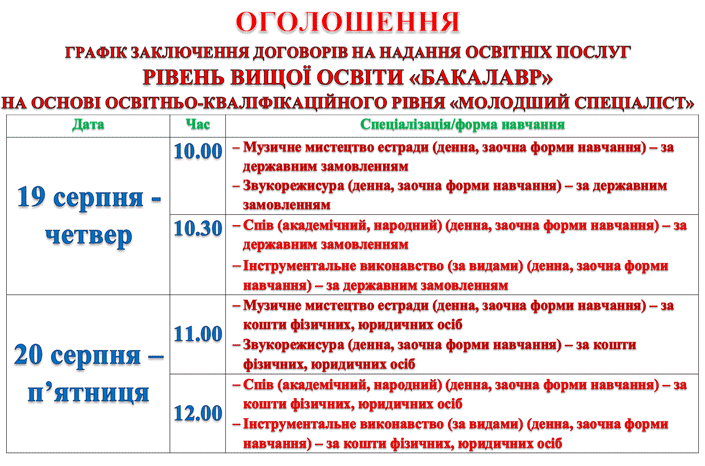 Розклад консультацій, творчих конкурсів для вступників денної та заочної форм здобуття освіти, що вступають на добір за кошти фізичних, юридичних осіб рівня вищої освіти "Бакалавр" на основі освітньо-кваліфікаційного рівня "Молодший спеціаліст"