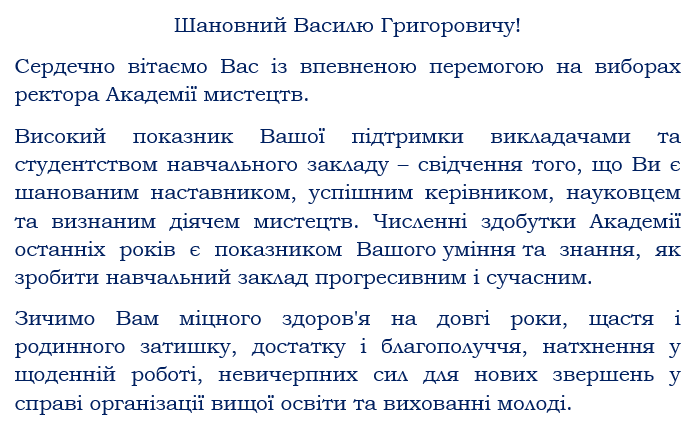 У кінці заходу Рубаненко С.М., голова виборчої комісії, урочисто оголосив результати виборів ректора Академія. Переможцем став кандидат культурології, професор, заслужений діяч мистецтв України Романчишин В.Г.