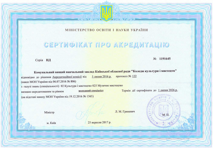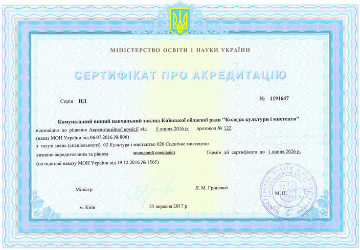 У 2016 році Міністерством освіти і науки України навчальний заклад було акредитовано за спеціальностями: «Хореографія», «Менеджмент соціокультурної діяльності», «Музичне мистецтво», «Сценічне мистецтво» – на 10 років.